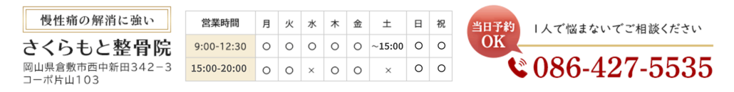 他院ではいつもの治療をローテーション通りに行い通院が長くなっていましたが、さくらもと先生は丁寧に毎回痛い所を聞いてくださり、対応してくださいました。